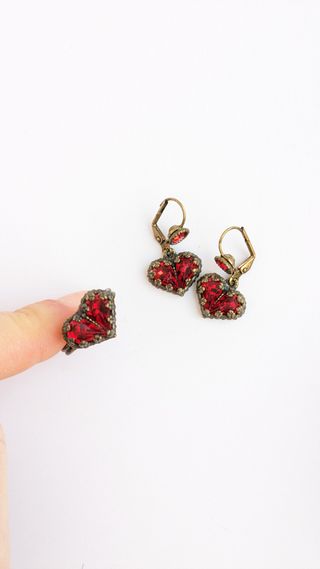 Pendientes colgantes de corazones. Anillo de corazón ajustable. Piedras de color rojo intenso brillantes y transparentes. Procedente de Praga. Sin usar.