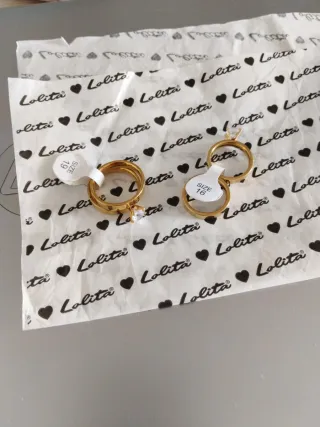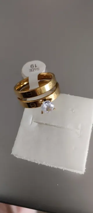 Conjunto de Anillo y Pendientes metálicos chapados en Oro 925 con piedra brillante Talla del anillo: 23, mide 20 mm diametro Longitud pendientes: 15 mm No se la marca, pero me obligan a poner una.