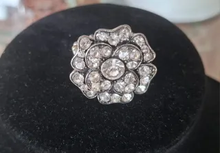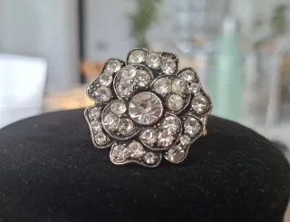 Elegante anillo con diseño de flor adornado con cristales tipo strass. Detalles en metal plateado. Cristales brillantes. Ajustable
