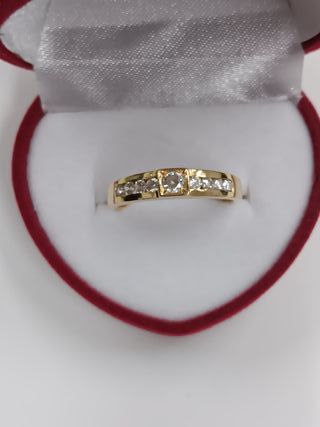 Elegante anillo de oro de 18 quilates, adornado con una hilera de circonitas . - Diseño clásico y atemporal. - Montura de oro amarillo.Pesa 3.75 gm. Talla 16 Ref.J00000986 Estamos en C/Indústria 285 Bajos 1 BARCELONA Hacemos envíos a domicilio. Consúltanos sin compromiso PRECIOS NO NEGOCIABLES