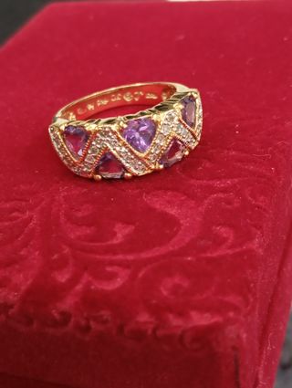 Elegante anillo de oro de 18 quilates con un diseño único. - Engastado con amatistas. - Detalles de diamantes. - Acabado en oro amarillo. Pesa 5.95 gm. Talla 19. Ref.J00000270 Estamos en C/Indústria 285 Bajos 1 BARCELONA Hacemos envíos a domicilio. Consúltanos sin compromiso PRECIOS NO NEGOCIABLES