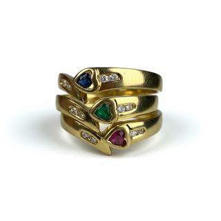 RE1863 Elegante anillo de oro de 18 quilates con un diseño único. Tres gemas centrales en forma de corazón: zafiro azul, esmeralda verde y rubí rojo, acompañado por pequeños diamantes incrustados a lo largo de la banda. TALLA: 11 PESO: 5.50gr