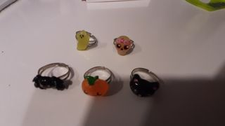 cinco anillos de Halloween para mano de niña con diferentes motivos creepes: araña, calabaza, calavera, fantasma y gato negro... recoger en zona matadero - Usera o bien envío...