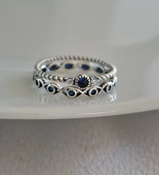 -Envíos gratis a partir de 40€. 🛫 Envios en 24h. Todos los pedidos van en caja o bolsita de joyería. 💍 Conjunto de dos anillos de plata de ley con un diseño delicado y elegante. - Anillo superior con acabado trenzado gemas color azul y transparentes. - Anillo inferior con diseño de ojos y gema azul central rodeado de circonitas.