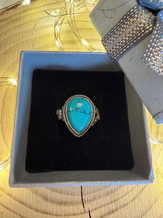 Elegante anillo con un diseño de gota y una piedra turquesa. Talla 12mm en la descripción no deja poner menos mm. Adjunto foto medida - Elaborado en plata de ley 925. - Piedra central con forma de gota. - Detalles trenzados en el aro. Revisen mi perfil . Regalo con pedido superior a 25€