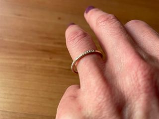 Elegante alianza fabricada en carbono y paladio, adornada con tres pequeños diamantes. - Diseño moderno y sofisticado. - Combinación de materiales de alta calidad. Nunca usada Tags: anillo, boda, venta en persona, diamantes, paladio, intercambio