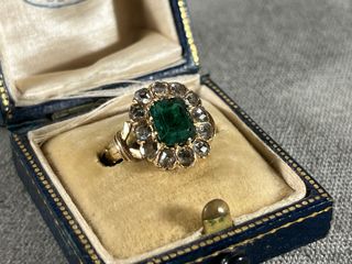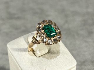 Anillo isabelino siglo XIX ORO 18k Esmeralda natural talla Esmeralda y diamantes talla rosa naturales. - Esmeralda central talla Esmeralda antigua con inclusiones velos negros normal en esmeraldas antiguas (0,95ct) Color: verde intenso medio–profundo, ligeramente azulado - Diamantes en orla talla rosa antigua (12 x 0,06ct = 0,72 ct) - Oro 18k contrastado - Talla 14,5 (17,3 mm) - Peso: 2,4 gr