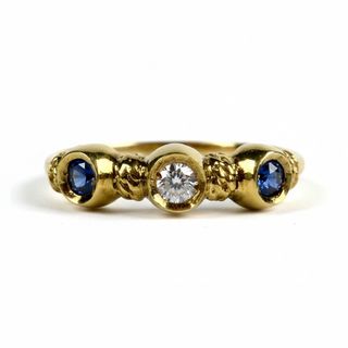 Elegante anillo de oro de 18 quilates con un diseño único. Cuenta con un diamante central de 0.05ct y dos zafiros azules a cada lado de 0.1ct en total. TALLA: 13 PESO: 1.83gr Incluye certificado de calidad emitido por joyeria, donde se detallan los materiales y caracteristicas de la pieza.