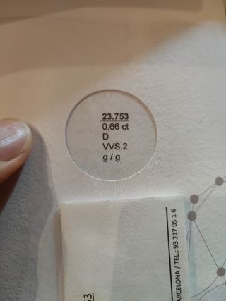 Diamante talla brillante 0'66ct color D pureza VVS2 sin florescencia. Con certificado JORGC.