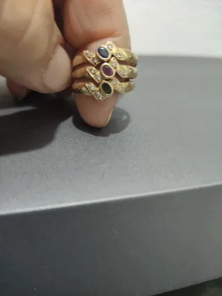 Conjunto de tres anillos unidos de oro de 18 quilates, cada uno adornado con una piedra preciosa y pequeños diamantes. - Anillo superior con zafiro azul. - Anillo central con rubí. - Anillo inferior con esmeralda verde. - Diseño elegante con detalles de diamantes. Probar sin compromiso. NO VENDO AL PESO .