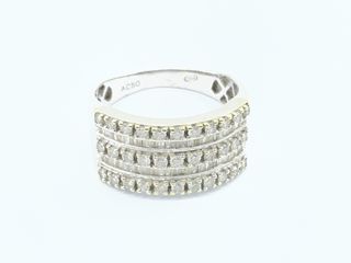Elegante anillo de compromiso de la marca Nivol's.Oro blanco y diamantes baguette - Diseño en plata con detalles de circonitas. - Talla 12.