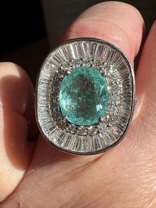 Espectacular sortija con una turmalina Paraiba central de casi 6 quilates, natural, sin ningún tratamiento, de Mozambique, con su magnifico y característico color vivid greenish blue . Es la única mina de esta turmalina junto con la de Paraiba, en Brasil. Rodeada de diamantes de diferentes tallas: brillante y baguette calidad extra: color G pureza VVS - Turmalina Paraiba de corte ovalado. - Diamantes talla baguette y brillante. - Montura en oro blanco.
