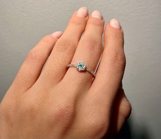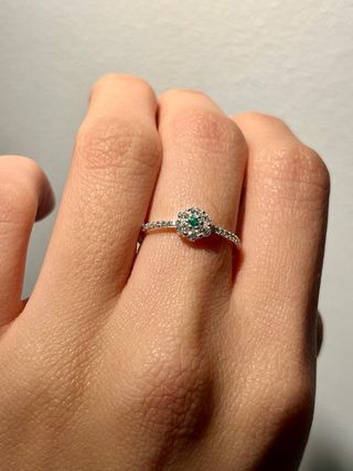 Precioso anillo de compromiso. - Es una pieza elegante y delicada. - Tiene una esmeralda central rodeada de circonitas. - La montura es de plata.