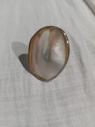 Anillo grande con un diseño único y elegante, perfecto para complementar cualquier atuendo. - Pieza central de nácar con reflejos iridiscentes. - Montura metálica con acabado dorado.