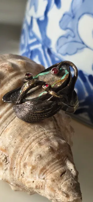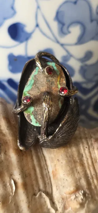 Plata & Bronce con Piedra Natural turquesa rustica Pieza única de gran carácter, realizada en plata combinada con bronce, con espectacular piedra central verde turquesa con matriz natural que conserva su belleza orgánica y auténtica. El diseño envuelve la piedra con formas vegetales en relieve, creando una estructura escultórica con movimiento. Los pequeños cabujones rojos facetados aportan luz y contraste, elevando la pieza a una joya con personalidad propia. 💎 Piedra natural con vetas irrepetibles 🌿 Trabajo artesanal con volumen 🔥 Detalles en rojo que iluminan el conjunto 💍 Anillo grande, muy favorecedor