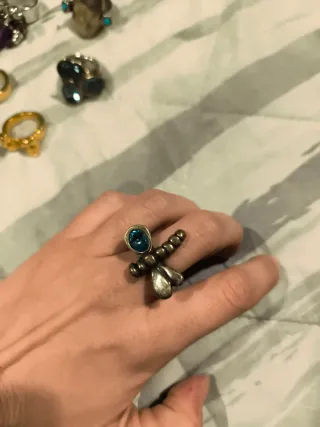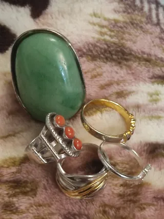 Conjunto variado de bisutería con varios anillos. - Anillo grande con piedra verde. - Anillo dorado con detalles. - Anillo plateado con tres piedras rojas. - Anillo plateado con detalles dorados. - Anillo fino plateado.