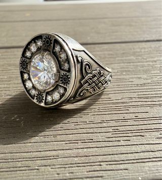 Elegante anillo de plata con un diseño llamativo. - Circonita central grande. - Detalles de circonitas pequeñas alrededor. - Grabado de nudo celta en los laterales.