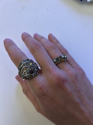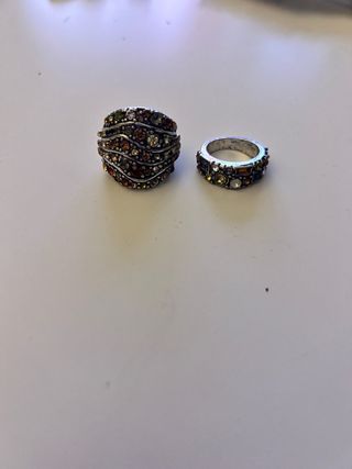 Conjunto de dos anillos de la marca Zara. - Diseño con incrustaciones de piedras. - Combinación de tonos multicolor y plateado. - Anillo fino talla S = 12 - Anillo grande talla M = 15