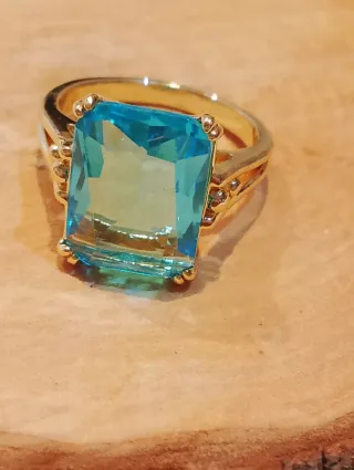 Anillo vintage con gran piedra azul clara facetada (posiblemente topacio o aguamarina) rodeada de marcasitas. Diseño elegante de estilo Art Deco. La piedra tiene un brillo muy bonito y cambia ligeramente de tono según la luz. Pieza llamativa y única.” Sello 925 visible en el interior. Diseño con piedra rectangular transparente y detalle estilo marquesitas alrededor. Talla aprox. 18 mm. Peso aproximado 4 g (mi báscula antigua marca más, pero prefiero indicar menos por seguridad). Pieza llamativa, elegante y con carácter retro. No es plata para fundir, es una pieza con diseño y presencia.
