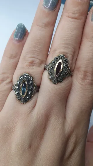 Elegantes anillos de plata de ley con un diseño vintage y detalles en marquesitas y una piedra grande central. - Plata de ley 925. - Diseño con incrustaciones de piedras. - Estilo vintage. SOLO TENGO DISPONIBLE EL DE LA PIEDRA AZUL. -piedra azul talla 15ES Envío o entrego a mano. Precio por 1 anillo.