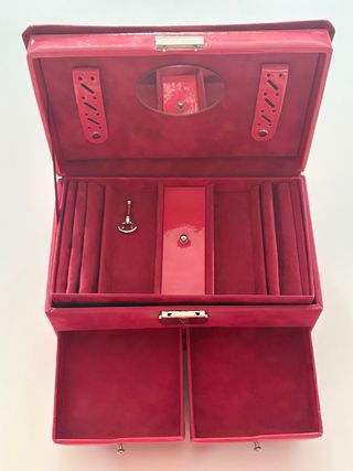 Elegante joyero original de Sacher, fabricado a mano en Alemania. Información de la etiqueta: • Handmade in Germany • Annaberg-Buchholz • Erzgebirge Características: • Interior de terciopelo rosa • Espejo interior • Compartimentos para anillos, pendientes, pulseras y collares • Compartimento central • 4 cajones inferiores para más almacenamiento • Incluye llave Joyero de buena calidad ideal para organizar joyas o como regalo. Estado general bueno con leves marcas de uso (ver fotos). ✔ Revisado y en buen estado. ⚠️ No acepto devoluciones.