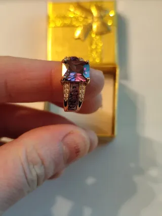 Elegante anillo con un diseño llamativo. - Banda dorada con detalles de piedras moradas. - Centro con una piedra principal grande de color morado. - Acompañado de pequeñas piedras blancas alrededor.