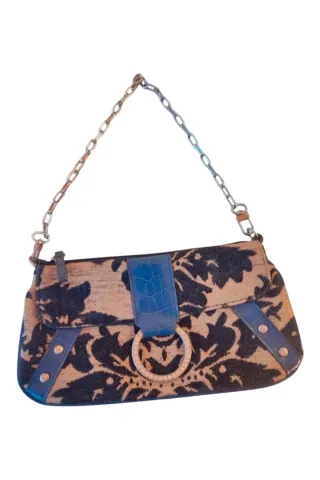 Bolso de Hombro Vintage Estilo Y2K de la marca NEXT. - Bolso de hombro estilo baguette o clutch, un look de principios de los 2000 (Y2K). Presenta un llamativo tejido tipo brocado o jacquard en tonos azul marino oscuro (casi negro) y beige/arena, con un estampado floral o damasco. - Cierre de solapa con un anillo metálico grande y detalles en piel sintética efecto cocodrilo en azul. - Correa corta de cadena metálica plateada, ideal para llevarlo al hombro o en la mano. - Detalles de tachuelas y ribetes en piel sintética azul. - Forro interior azul con un bolsillo con cremallera. Medidas: 13 cm x 24 cm x 5 cm