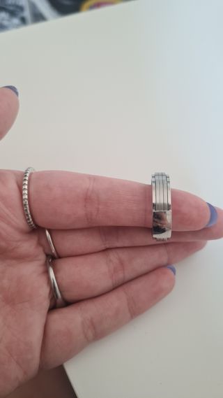 Muy bonita, aro ancho con piedrecitas, tiene el símbolo de la plata (925)pero yo no creo que sea de plata, por eso la vendo muy barata, es o para un dedo grande de mujer, o de hombre normal