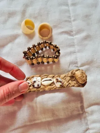 Seminuevo!! Conjunto formado por dos Anillos de hueso tallados en tono marfil, en tallas grandes, ideales para poner en dedos índice y corazón. Muy bonitos puestos!! Diseño artesanal, hechos manualmente. Comprados en un viaje a la India. Y dos pulseras UNISEX realizadas también de maneral artesanal con conchas y piedras de la India, piezas típicas de allí, confeccionada además una de ellas con fibras de mimbre. Súper bonitas puestas!! Tamaño adaptable a cualquier muñeca Mujer u hombre. Se venden a precio muy económico el lote de las 4 piezas estilo bohemio, inspirados en la India🌺 🌺 Medida anillos aprox: 2'4 x 2'3cm y 2'6 x 2cm