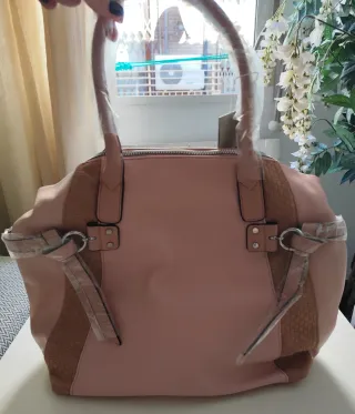 Bolso grande de mano y bandolera, en tonos rosas. Nuevo, con etiquetas. - Cierre principal con cremallera. - Dos asas cortas para llevar en mano. - Correa larga ajustable y extraíble para bandolera. - Detalle de tiras con hebillas y anillas en los laterales. - Paneles laterales con textura.