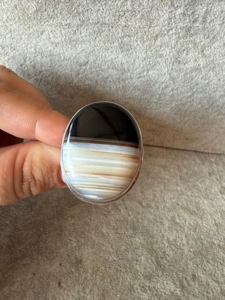 Elegante anillo con un diseño único y una piedra natural llamativa. La banda es de plata 925. TALLA 18/19 - Piedra con bandas en blanco, marrón y negro. - Montura de plata 925. ES UN ONIX TAMAÑO grande envio a toda españa
