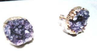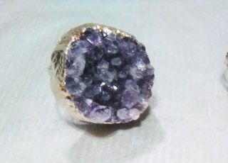 Anillo grande con un diseño único de drusa de amatista. La montura es de plata con un acabado dorado. - Drusa mineral de amatista. - Montura de plata con baño dorado.