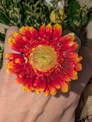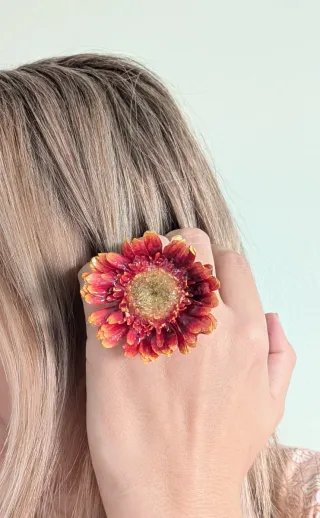 Anillo artesanal realizado con gerbera real natural, cuidadosamente seca y encapsulada en resina para conservar su forma y sus colores intensos rojo y amarillo. No es una flor artificial ni una imitación: 👉 es una gerbera auténtica convertida en joya. Cada anillo es único e irrepetible, muy vistoso y con mucha presencia, pero ligero y cómodo de llevar. Una pieza llamativa para quien no quiere pasar desapercibida. ✨ Detalles: Flor: gerbera real natural Técnica: flor natural seca + resina Hecho a mano Pieza única Anillo grande y llamativo Base de anillo ajustable