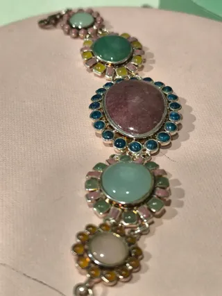 Pulsera de la colección Camille de Tous. - Diseño con piedras semipreciosas. - Cierre de mosquetón. - Detalles en tonos pastel y azul. Pieza de coleccionista, dificil de encontrar.Es grande y espectacular una vez colocada en la muñeca.Totalmente original. Tengo el anillo a juego colgado en mi perfil Seriedad ( podéis ver mis valoraciones) Más cosas interesantes en mi perfil