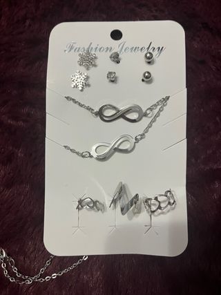 Conjunto de bisutería con varios accesorios. - Dos collares con símbolo de infinito. - Juego de pendientes con diferentes diseños. - Varios anillos. - Acabado plateado.