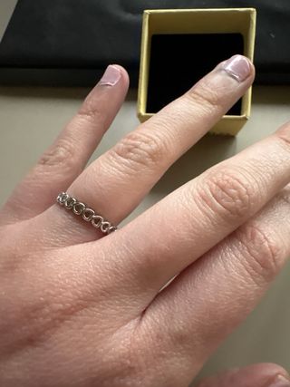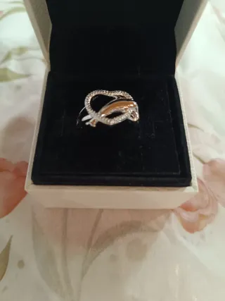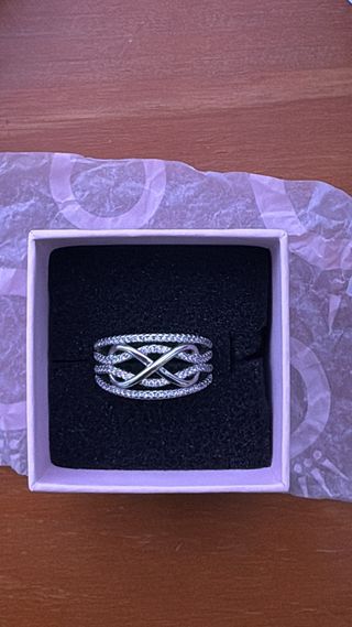 Anillos de plata con diseños variados. - Anillo con alianza de corazones 18€. - Anillo con forma infinito 20€. - Anillo con diseño de rosa 25€. - Anillo con líneas entrelazadas y pequeñas piedras 50€. Pandora ORIGINAL