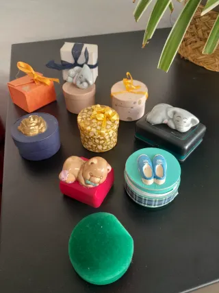 Conjunto de encantadoras cajas decorativas, perfectas para guardar pequeños tesoros o anillos. -algunas cajas están muy usadas - Diseño de elefante dormido. - Caja con osito de peluche. - Caja con par de zapatillas. - Caja con rosa dorada. - Caja con lazo dorado. - Caja con lazo naranja. - Caja con lazo amarillo.