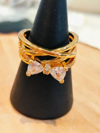 Elegante anillo con diseño de lazo y detalles de circonitas. - Acabado en tono dorado. - Dos gemas en forma de pera. - Diseño entrelazado.