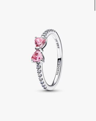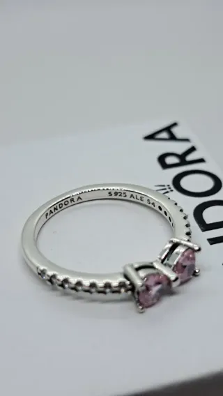 Anillo de la marca Pandora con un diseño encantador. - Dos corazones centrales en color rosa con forma de lazo. - Detalles de pequeñas piedras brillantes en la banda. Es la talla 48 de Pandora. Se vende por no usarse. Cualquier duda preguntar.