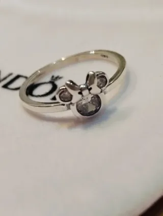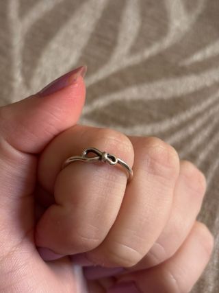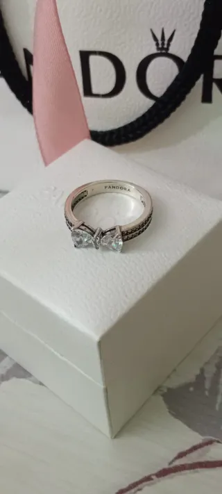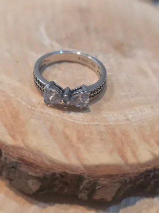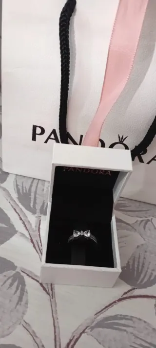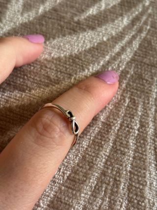 Anillo de Pandora con diseño de lazo. - Elaborado en plata. - Detalle de pequeñas piedras brillantes en el centro del lazo. Es la talla 54, no os fiéis de la talla que salta en el anuncio porque no sé a qué talla equivale.