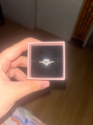 Conjunto de anillo y caja de la marca Pandora. - Anillo con forma de corazón. - Caja de regalo rosa con lazo y bolsa blanca - Incluye libro de autenticidad.