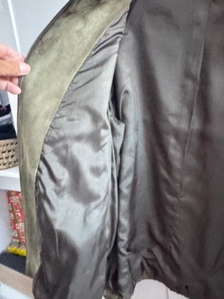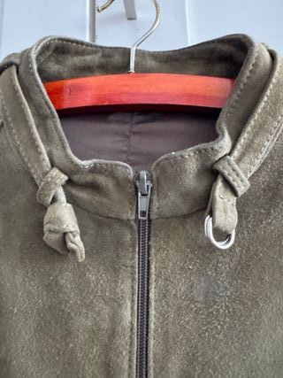 Chaqueta de ante en un bonito tono verde oliva. Perfecta para añadir un toque de estilo. Prenda ideal para Otoño y Primavera. Impecable. No se ha utilizado - Cierre de cremallera. - Detalle de anilla metálica. - Lazos decorativos en los laterales.
