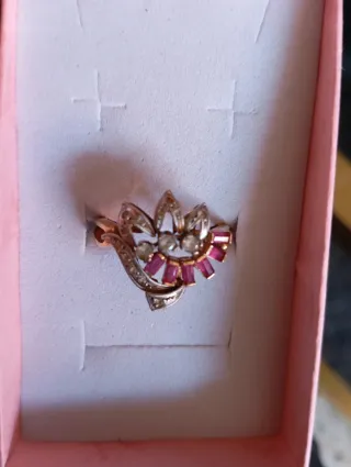 Elegante anillo de oro 18 K con un diseño floral adornado con piedras preciosas (rubíes y circonitas). - Diseño floral. - Combinación de piedras rojas y blancas. - Peso 4.13 gramos Precio no negociable.