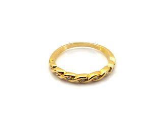RE1783 Precioso anillo de oro amarillo de 18 quilates con un diamante natural de 0.06 quilates engastado en el centro. Tiene un diseño muy elegante con banda trenzada, fino y moderno, ideal para uso diario o para ocasiones especiales. TALLA: 17 PESO: 1.35g Incluye certificado de calidad emitido por joyeria, donde se detallan los materiales y caracteristicas de la pieza.