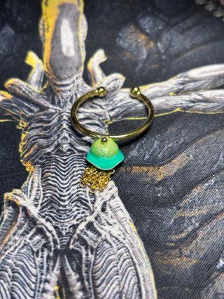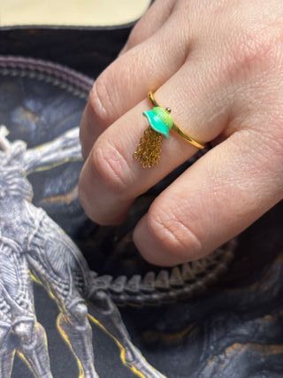 Anillo de la marca Les Nereides con diseño de medusa. Plata chapada en oro - Detalle de cadenas doradas. - Esmalte verde y detalles dorados.