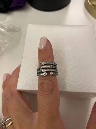 Anillo doble de la marca Pandora. - Talla 52. (16'9 mm) - Diseño con circonitas. Y plata de Ley. EL PRECIO TAN BAJO ES PORQUE LE FALTAN COMO ENSEÑO EN LAS FOTOS, 5 CIRCONITAS. (EL JOYERO TE LAS ARREGLA POR 5-6€ ). es precioso. Pero le faltan las 5 piedrecitas.