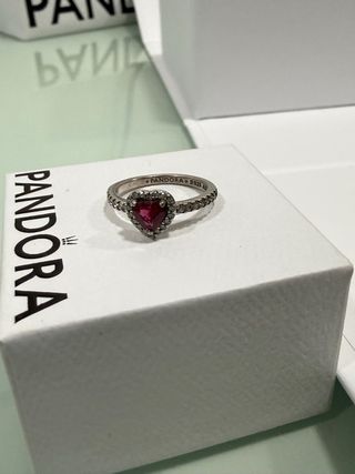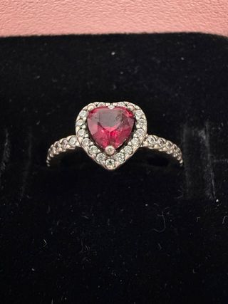 Anillo de la marca Pandora con un diseño de corazón central. La pieza principal es una gema de color rojo intenso, rodeada por pequeñas circonitas brillantes. Incluyo factura de compra. - Diseño de corazón. - Detalles en circonitas.