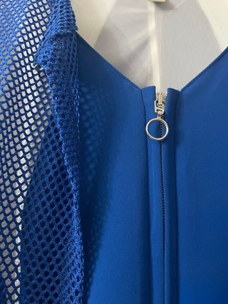 Vestido con detalles de malla y cremallera frontal. Acompañado de chaqueta bolero. Muy apropiado para celebraciones o eventos. Esta sin estrenar , no conserva la etiqueta pero nunca se ha usado. - Diseño de corte en V. - Cremallera plateada con tirador de anilla. - Detalle de malla en el hombro.