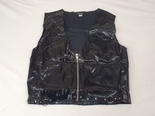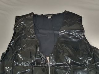 Chaleco de Vinilo para hombre de Elegant Moments. Cierre frontal con cremallera. 2 cintas con anillas metálicas en la parte inferior. Color negro. Talla L. 33% Poliuretano y 67% Poliester. Nuevo, a estrenar.