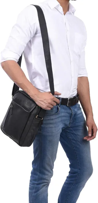 -SIN USAR- Falta una anilla a la cremallera de detras, ver ultima foto- STILORD 'Irving' Bolso de Hombro Piel Crossbody Bag Vintage Bolsa Bandolera Bolso de Mano Pour Tableta 10,1 & iPad Pulgadas de Cuero Autentico, Color:Negro -SOLO HAGO ENVIOS